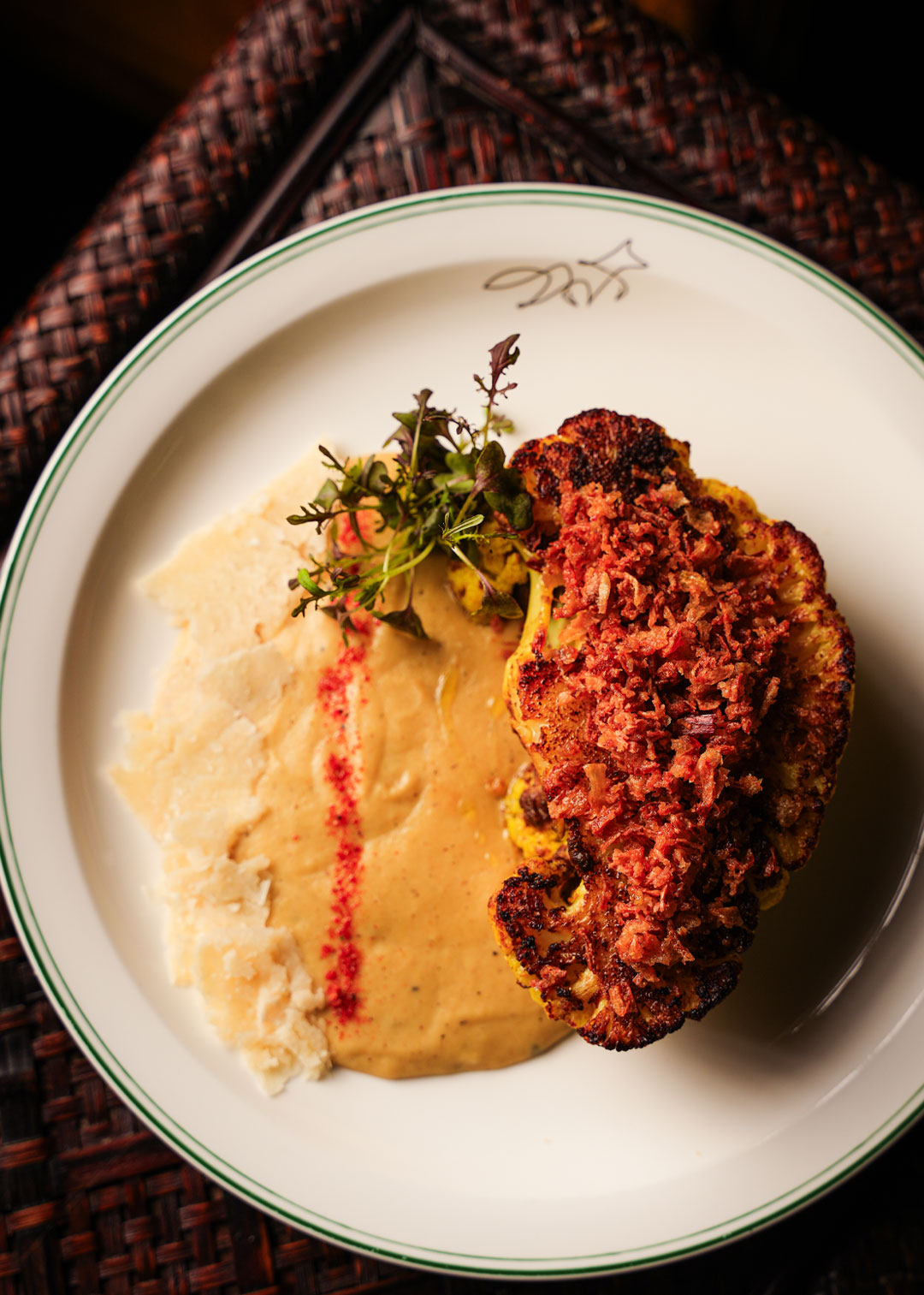 CAULIFLOWER STEAK26Marinated cauliflower with leek & potato puree, shaved parmesan, and crispy shallots.